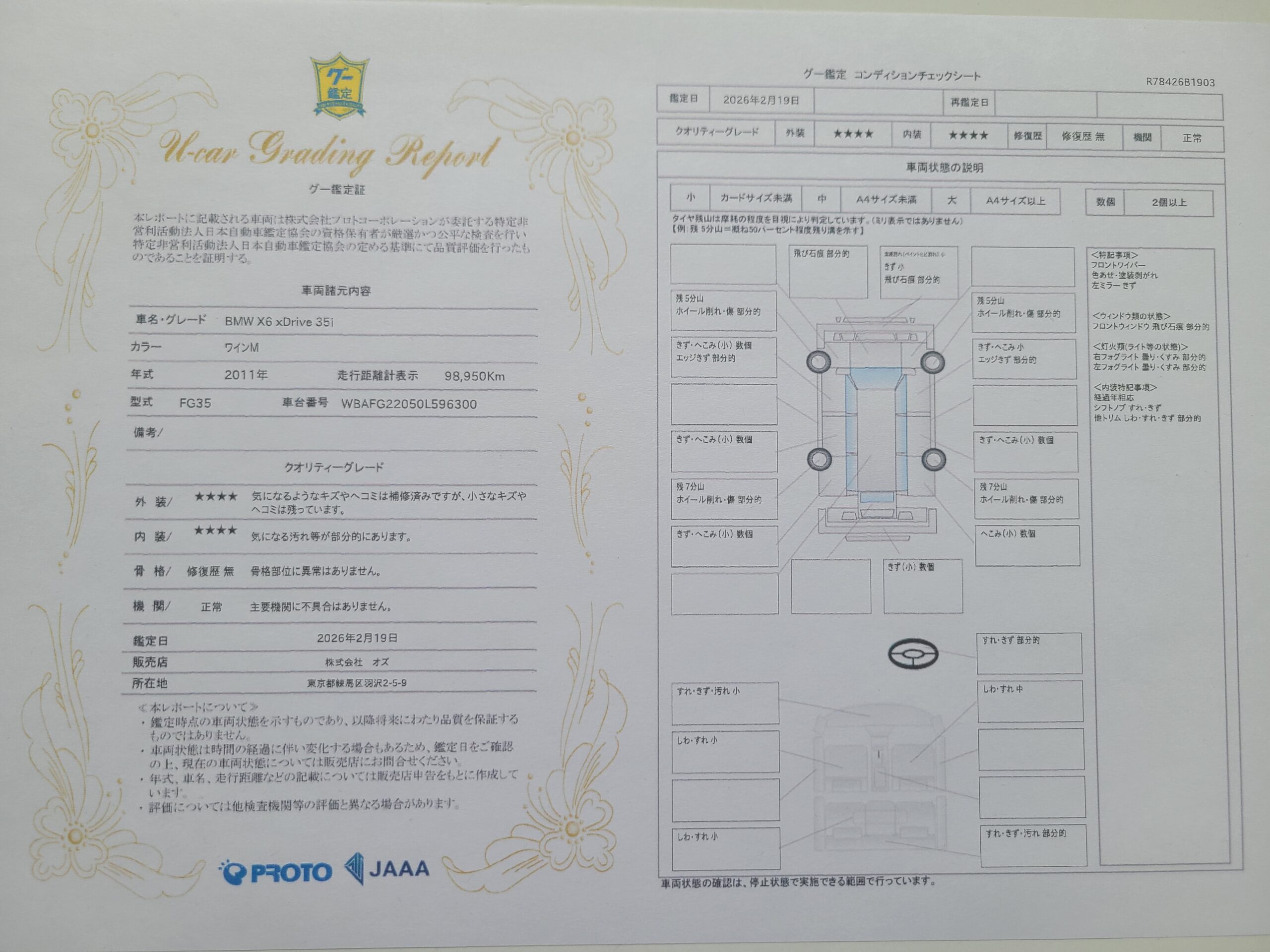 GOO鑑定書付 2011年 BMW X6 XDrive35Iが入庫しました。デイラー車 右ハンドル 8AT 車検令和8年12月21日 ベージュレザーシート サンルーフ 純正ナビETCバックカメラ パワーシート シートヒーター 前後センサー パワーバックドア リヤスモークフィルム 255/50-19 285/45-19(ピレリ スコーピオン ランフラットスタッドレスタイヤ装着) 取説 記録簿8枚有り 保証書 スペアキー 走行99400キロ 今回は、165万にて御提供です。